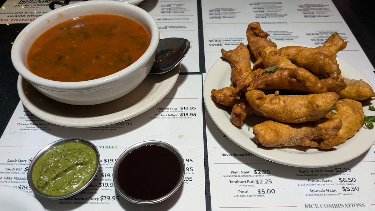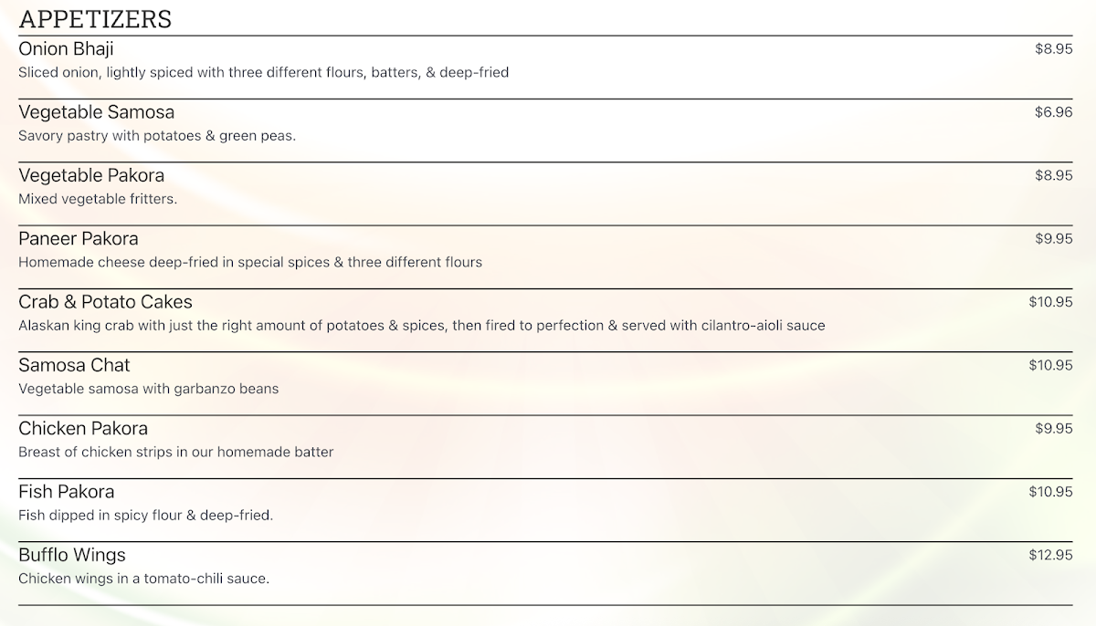 Patrons often enjoy menu highlights like Chicken Biryani, rich Butter Chicken paired with garlic naan, or the fresh and mildly spiced Prawn Coconut Curry. The salad bar and appetizers such as fish pakora and potato-stuffed samosas also complement the overall dining experience. These dishes feel right at home in the cozy, quiet atmosphere of the restaurant, where meals unfold at an easy pace and invite conversation.