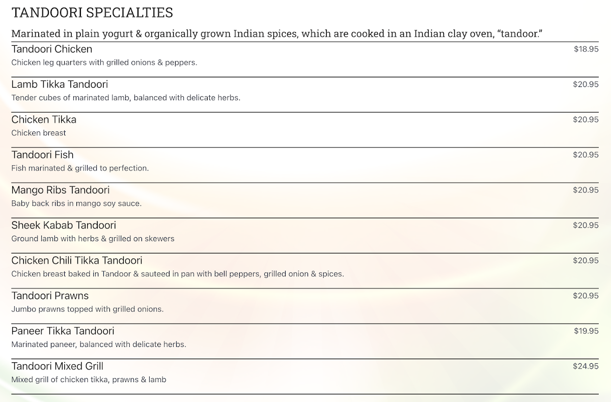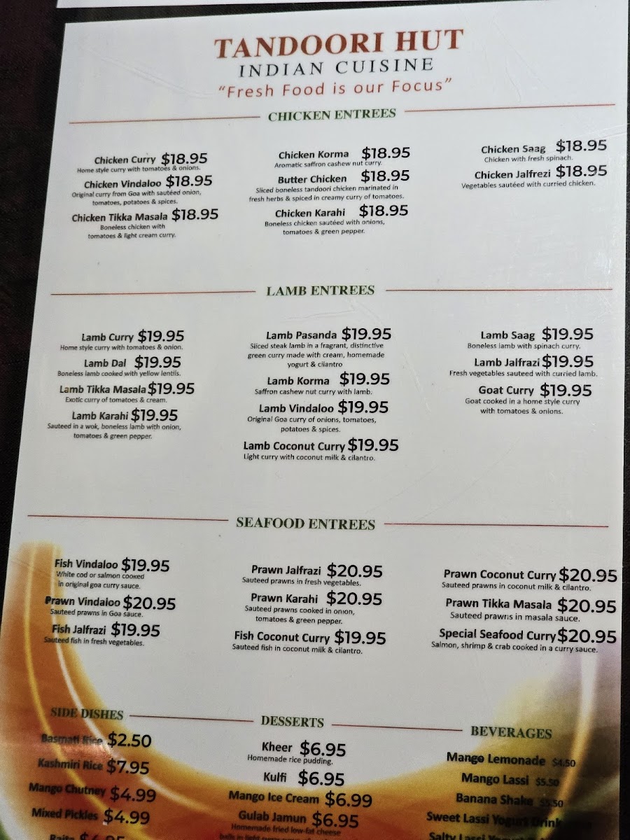 The menu at Tandoori Hut offers a warm and inviting selection of North Indian and Pakistani dishes with a focus on both traditional and comforting flavors. Ideal for those seeking familiar, hearty meals, it features a variety of options ranging from aromatic biryanis to flavorful curries and fresh breads. Whether you’re stopping by for a casual lunch or a relaxed dinner, there’s a thoughtful balance of vegetarian and meat-based dishes to suit different tastes and preferences.